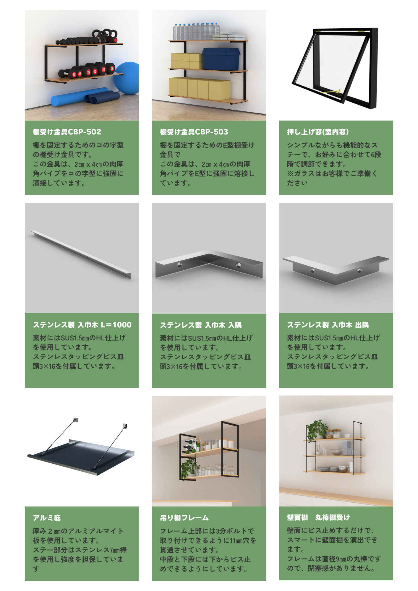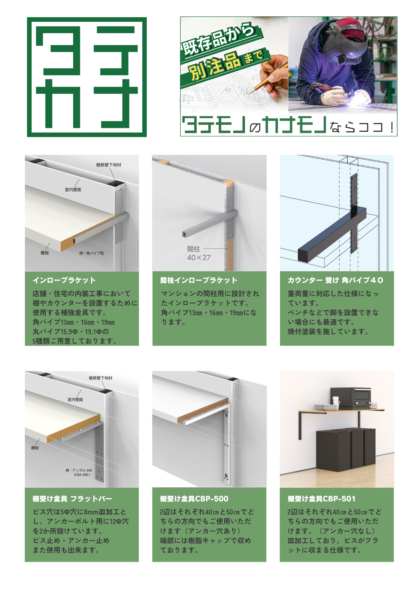タテモノカナモノは、店舗内装に必要な金物製品を中心に、一般的な売り場ではなかなか見かけない商品などを豊富に取り揃えております。